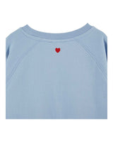 - Sky blue and poppy red graphic crewneck pullover sweater