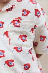 - Cream button-down top with a playful all-over telephone print