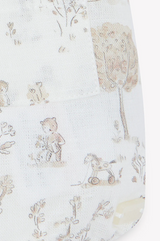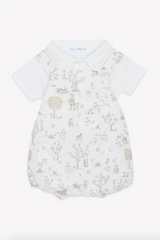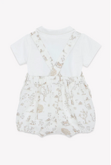 Overall features a Dungaree print of a garden theme with animals