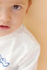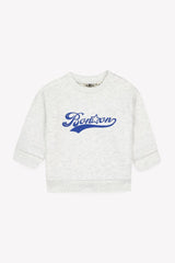 - Grey marl crewneck sweatshirt with navy blue graphic on front