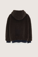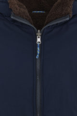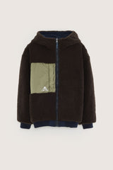 Relaxed reversible rain jacket with a zip front, an elastic waist, a large hood and kangaroo pockets. One side in dark blue nylon, the other in dark brown teddy.