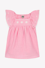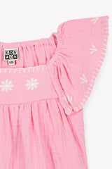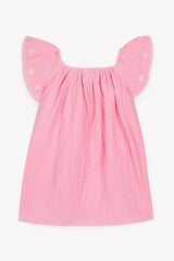 - Candy pink dress with hand-embroidered details and an airy silhouette