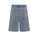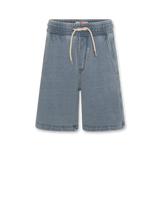 - Light wash denim shorts with elasticized waistband and a drawstring