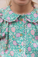 - Rounded Peter Pan ruffle collar with pink scalloped trim