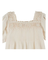 - Square neckline and yoke with hand-crocheted lace for a timeless, storybook feel